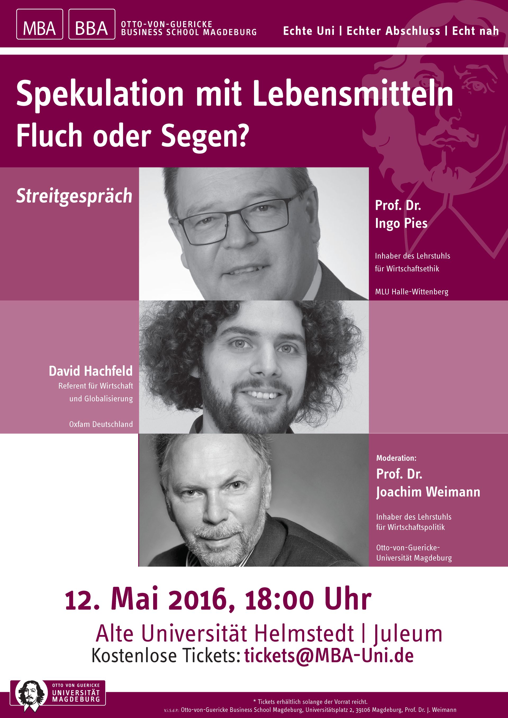 Ingo Pieß und David Hachfeld können mit ihrer Expertise neue Aspekte einbringen, die im Rahmen der berufsbegleitenden (klassischen) BWL-Weiterbildung nicht berücksichtigt werden können: Wie stehen Ökonomie und Ethik zueinander? Bestärken Spekulationen mit Lebensmitteln die Hungersnot? Antworten auf solche Fragen soll dieses Streitgespräch bieten. Wer teilnehmen möchte, kann sich unter tickets@MBA-Uni.de einen Platz reservieren (Einlass ist ab 17:30 Uhr). Im Anschluss an die Veranstaltung gibt es ein kleines Catering.