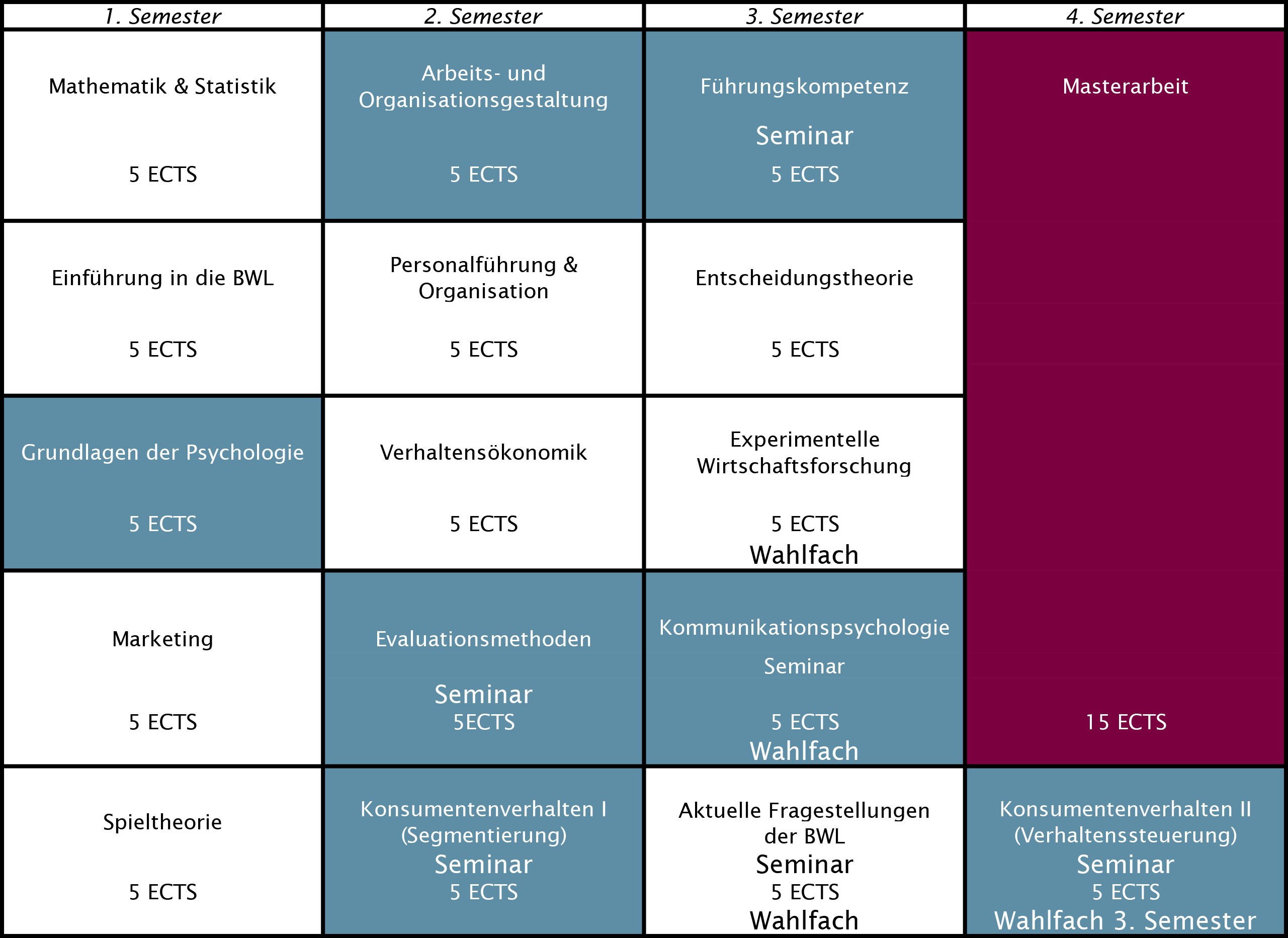 Der PSYCHOLOGISCHE TEIL der Ausbildung umfasst die Einführung in grundlegende Konzepte und Methoden der Psychologie und der Evaluation. Die speziellen Psychologiekurse decken Bereiche ab, die für wirtschaftspsychologische Fragestellungen hoch relevant sind. Beispielsweise wird im Bereich des Konsumentenverhaltens analysiert, wie Menschen sich in Entscheidungssituationen verhalten, welche Denkschablonen existieren und welchen Beeinflussungen wir unterliegen. Im Rahmen der Arbeits- und Organisationspsychologie steht das Erlebnis und Verhalten von Organisationen und Mitarbeitern im Vordergrund. Abgerundet wird die psychologische Ausbildung durch die Kommunikationspsychologie, in der Kommunikationsformen, aber auch die Barrieren und Fallstricke, die Kommunikation schwierig machen können, behandelt werden.